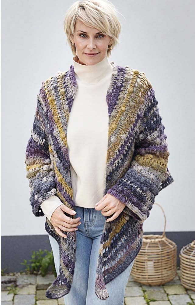 Накидка, связанная крючком идеально подходит не только для вечеринок, но и для будней. Пряжа секционного крашения с люрексом еще лучше искрится на фоне цветовой игры в готовом изделии.