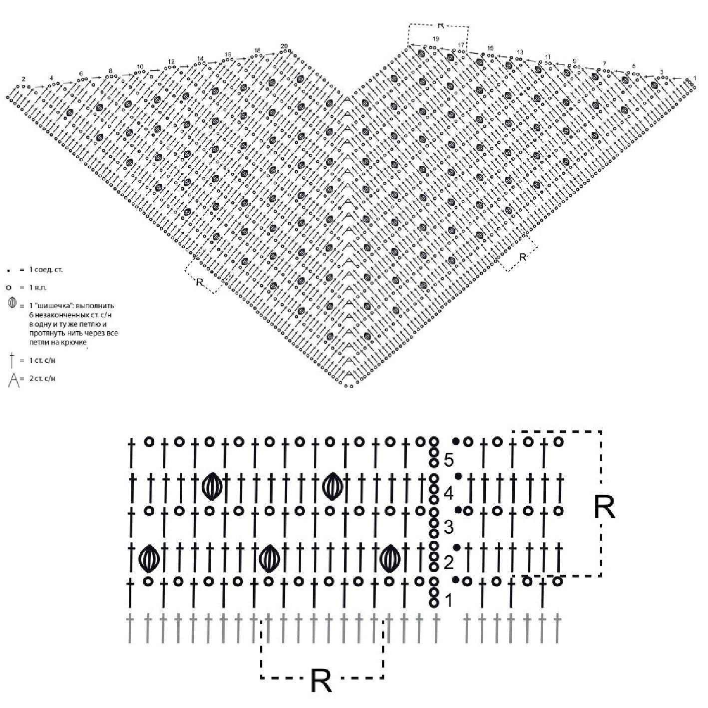 Силуэт накидки-палантина формируется за счет убавок: убавлять по 2 п. с обеих сторон и 4 п. посередине, за исключением 1-го р., где убавить только 2 п. посередине.