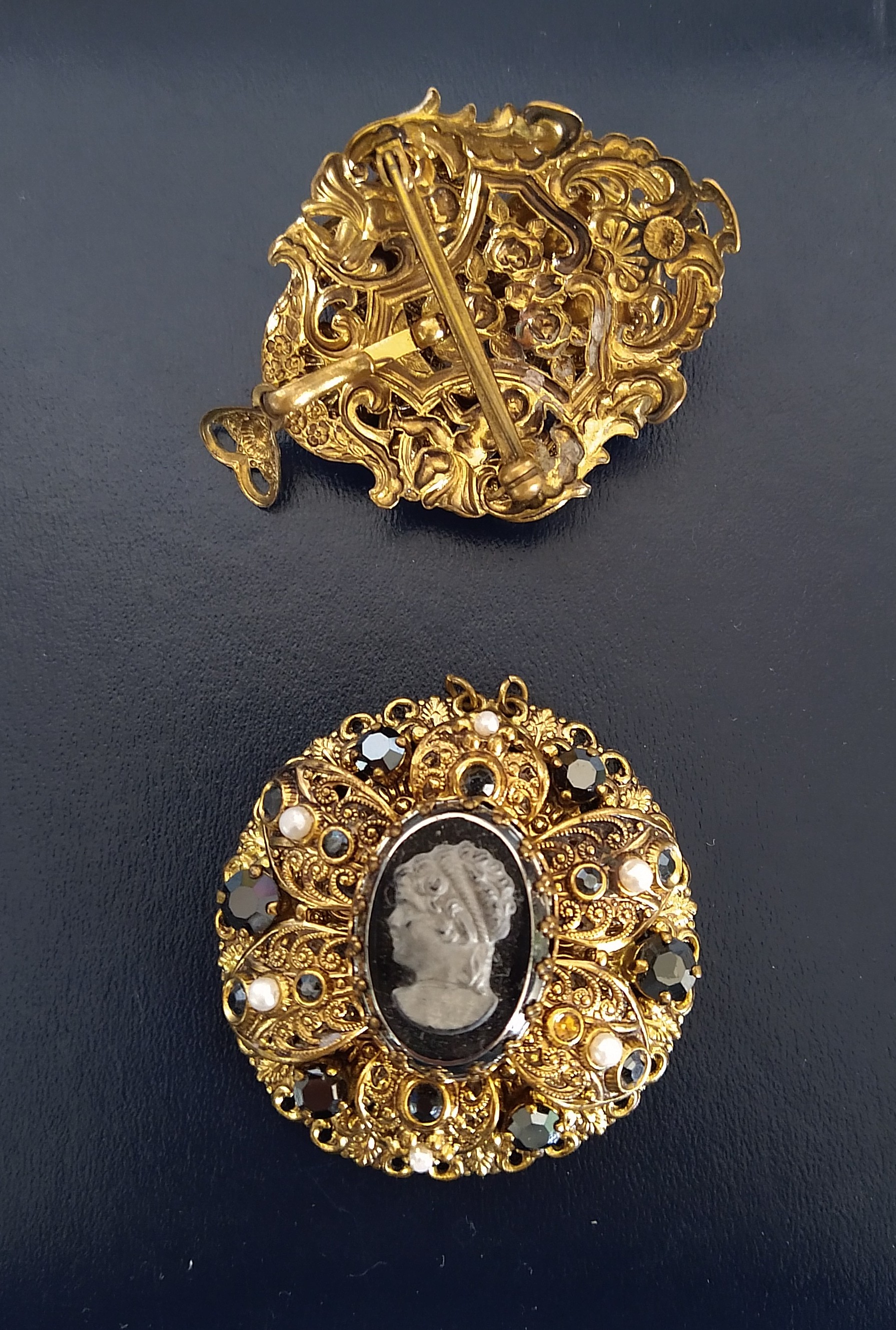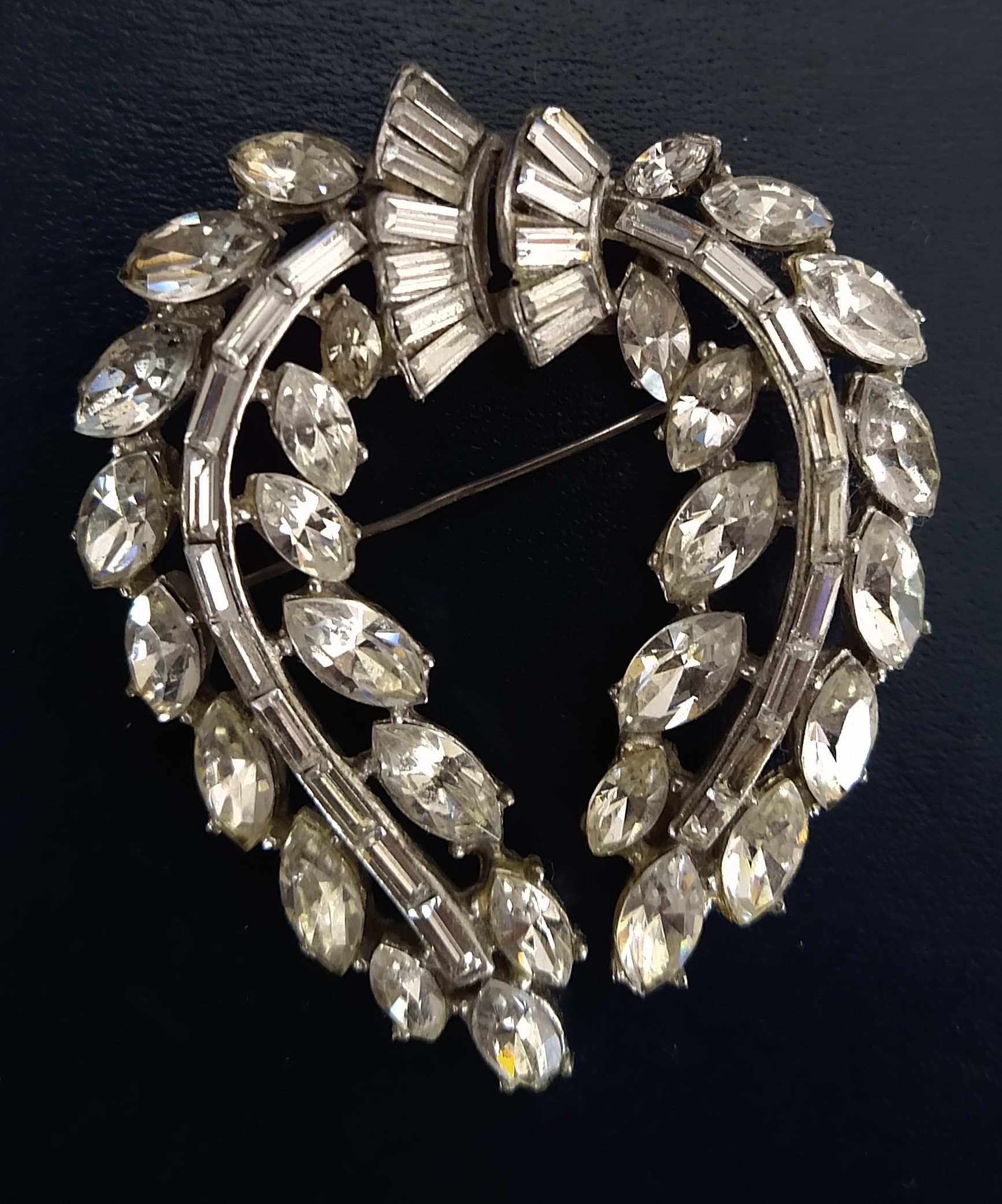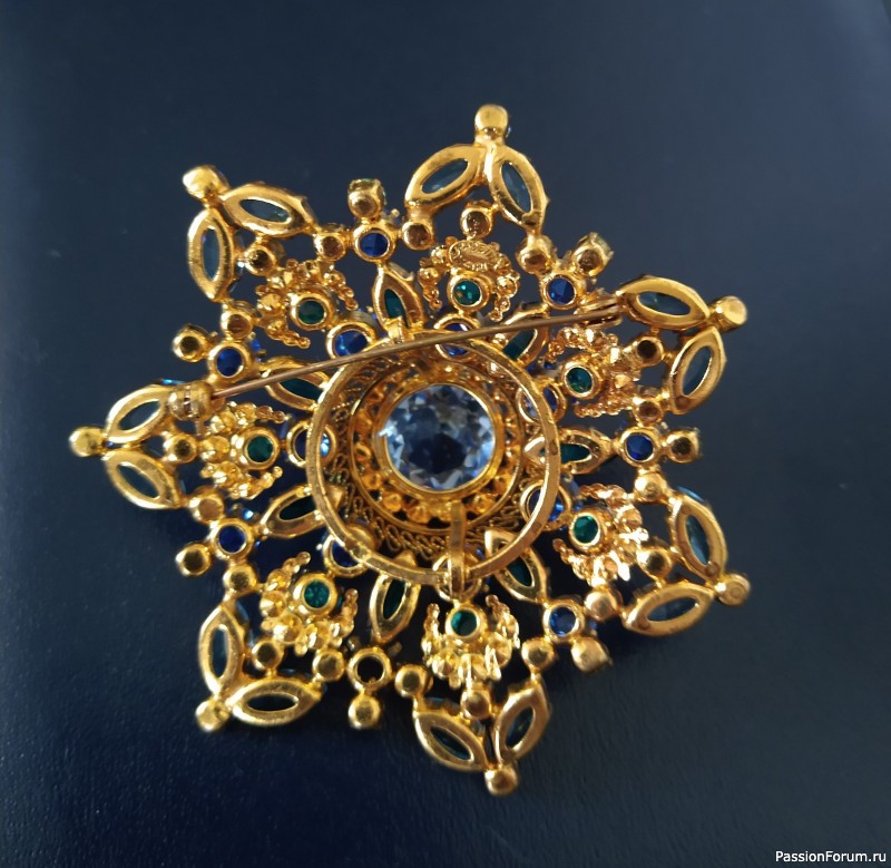 У этой броши купольная форма и стразы перевернуты, такое крепление также встречается в украшениях от Шрайнер.