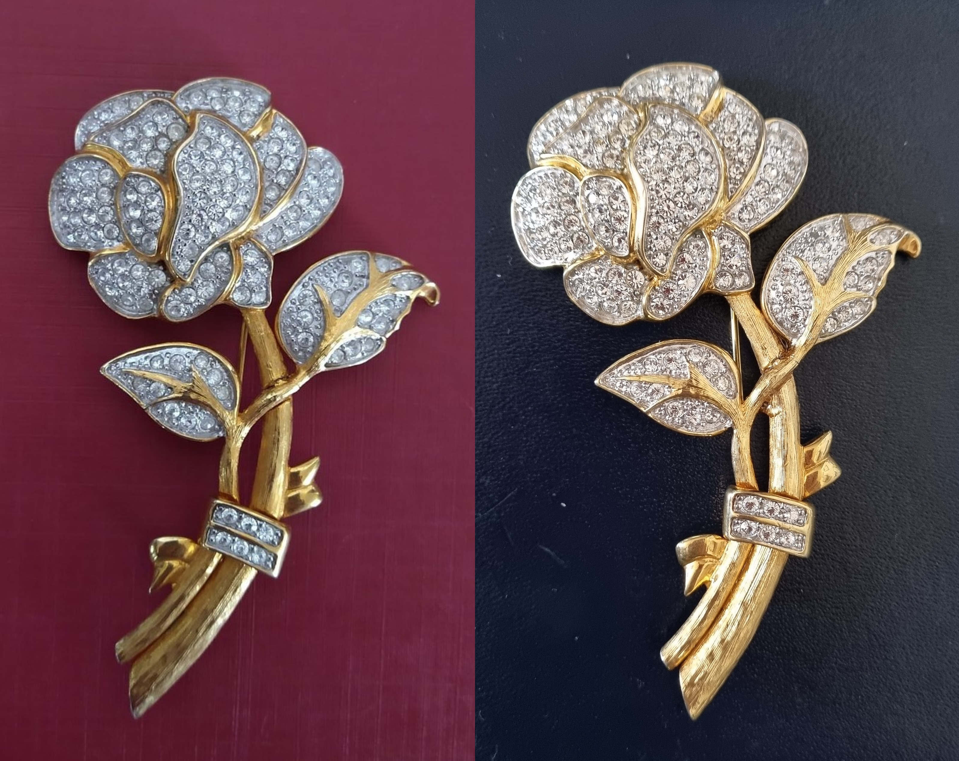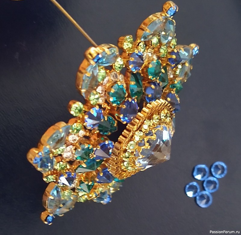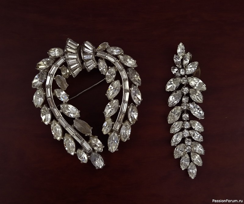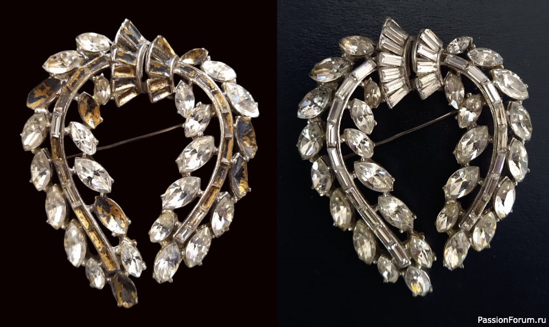 Начну с этой броши, ремонт ее был более длительным по сравнению c остальными из этого топика. Брошь не маркирована, но металлическая основа в хорошем состоянии. Купила я ее давно, багетные стразы у меня нашлись, но т.к. "маркизы" разных размеров пришлось поискать подходящую винтажную серьгу.