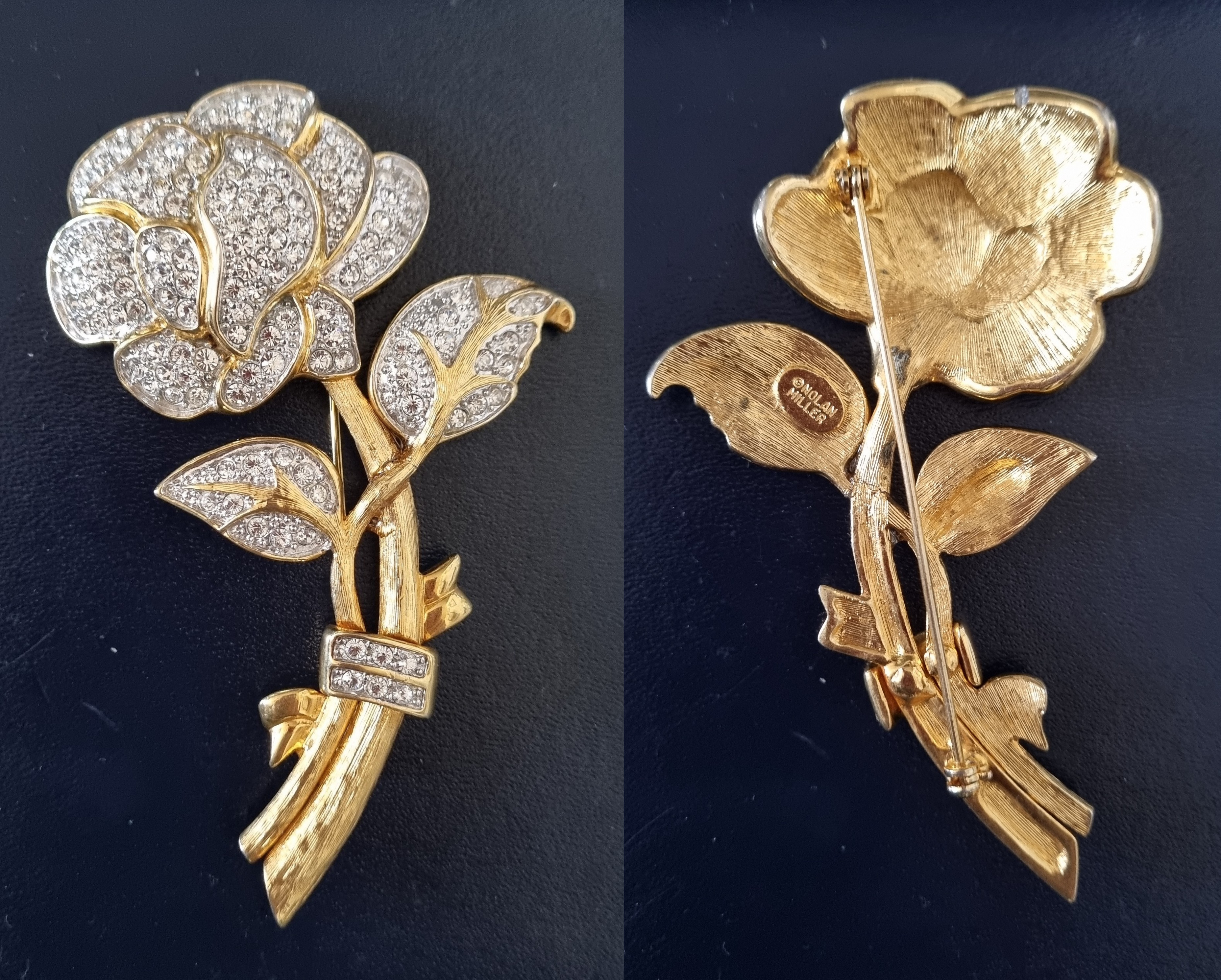 (Нолан Миллер- культовый американский бренд украшений и костюмов. Марка прославилась благодаря работе над сериалом "Династия" в 1980-х гг., где Миллер был главным костюмером. С 1983-1986 гг. он был четырежды номинирован на премию "Эмми" за костюмы к "Династии" и выиграл ее в 1984г., создав более 3000 нарядов и украшений для этого сериала.)-информация взята из интернета.