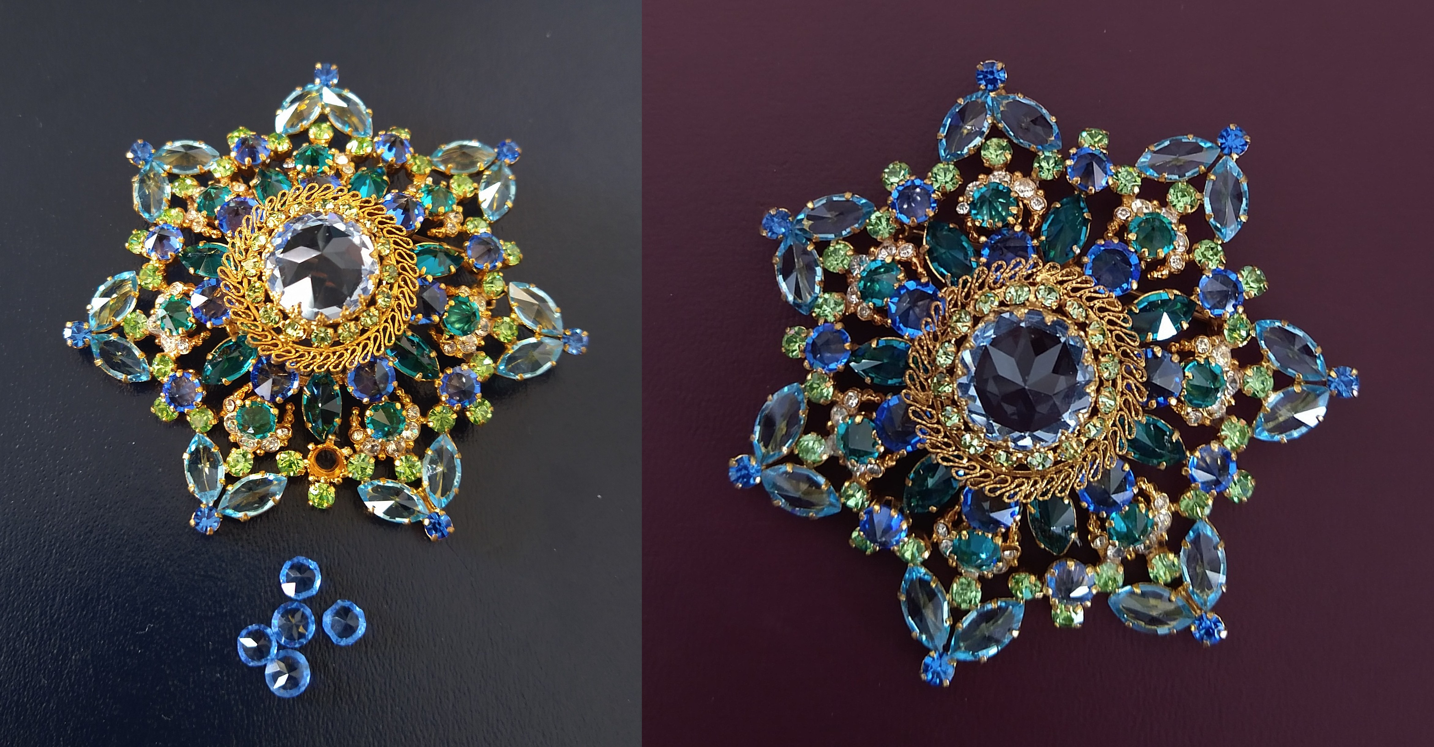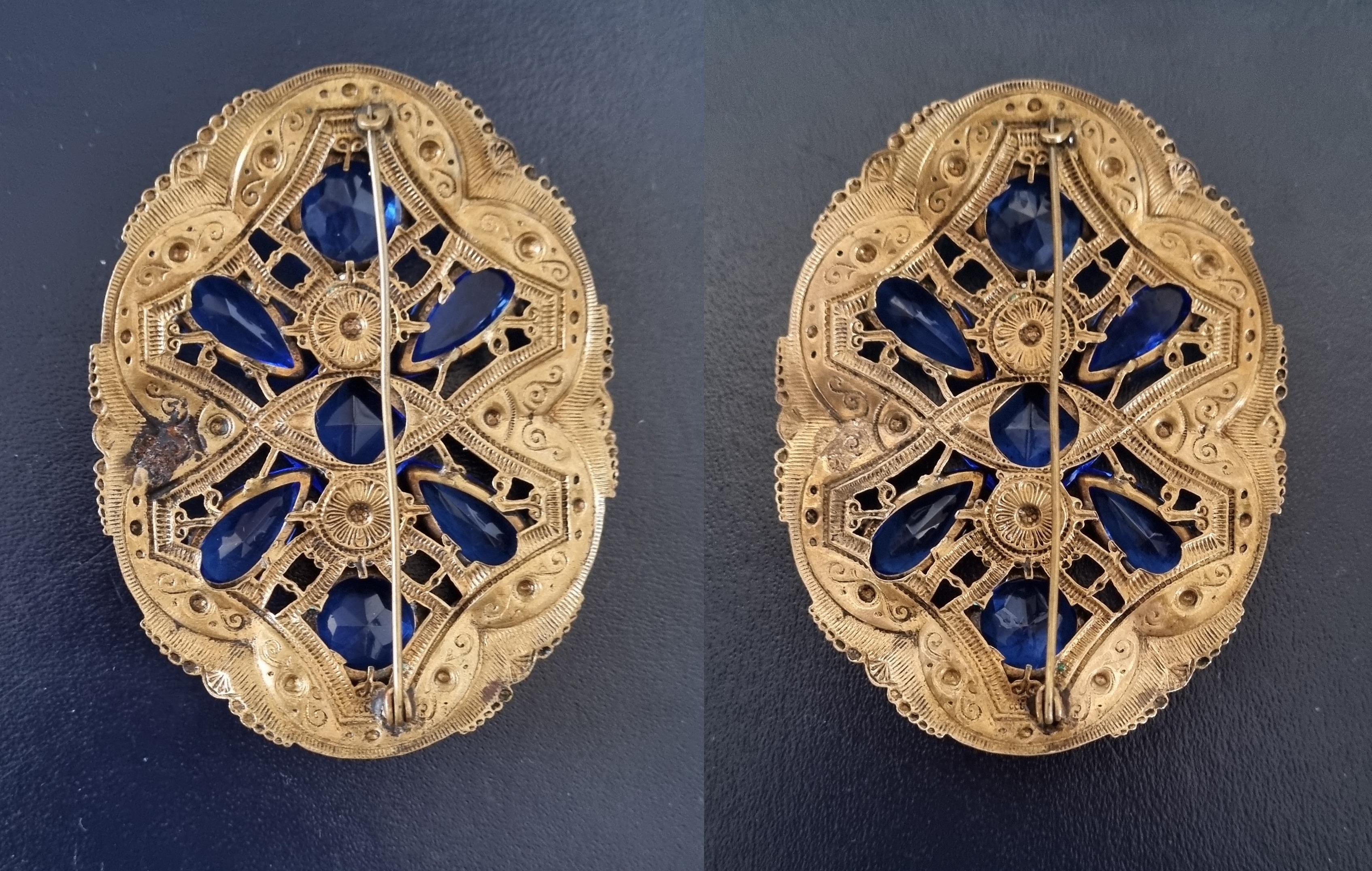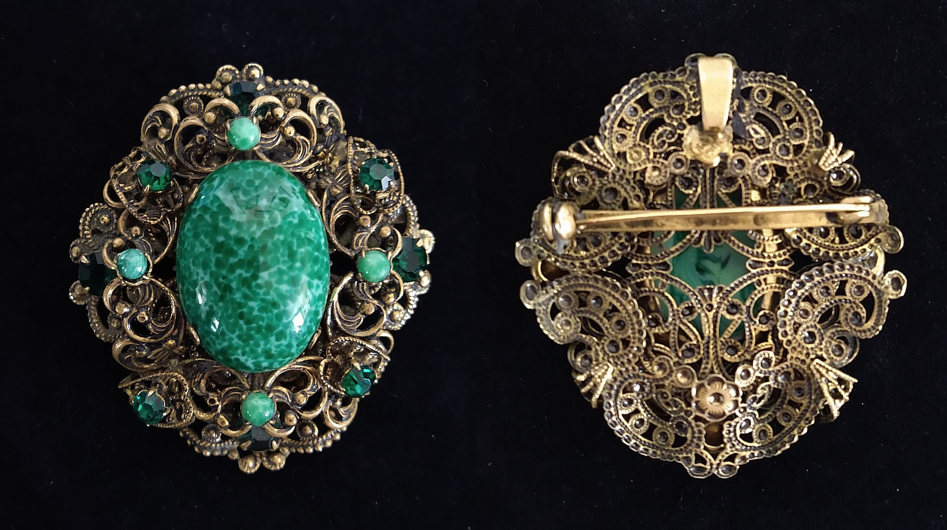 Брошь Чехословакия, есть маркировка- Chechslovakia, отсутствовали центральная вставка, 2 маленьких зеленых сраза и 1 маленький кабошон. У меня был кабошон "Пекинское стекло", сразу стала вставлять и забыла сфотографировать, какой была брошь при покупке.