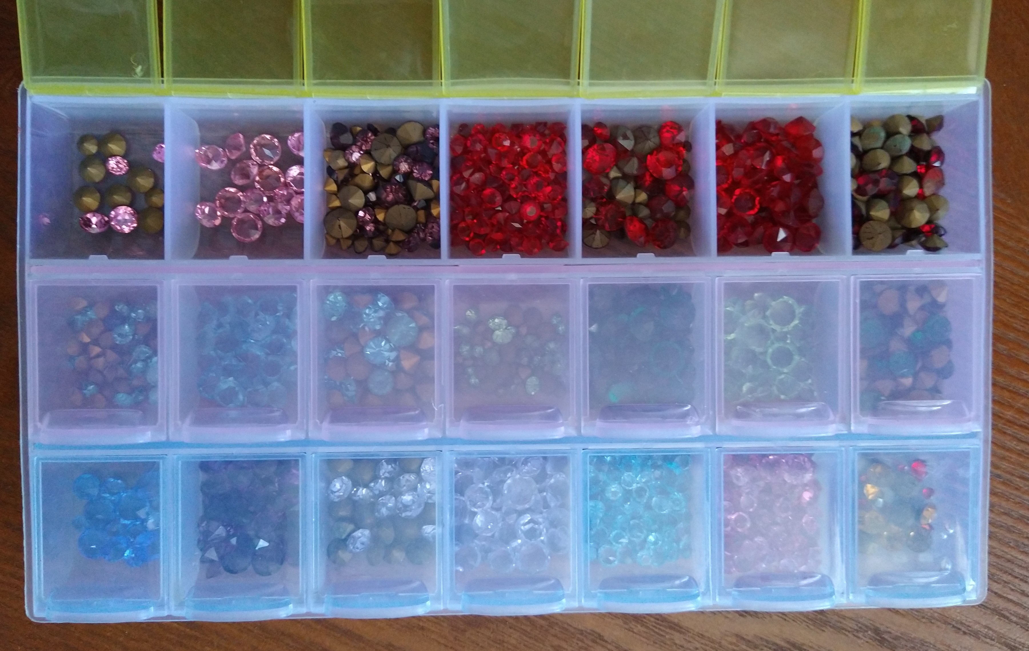 А вот и коробка со стразами и всякими вставками. Продавец предложил выбрать нужные, но все стразы были перемешаны и я поняла, что это не реально и спросила стоимость за всю коробку. Немного поторговалась, продавец уступил.