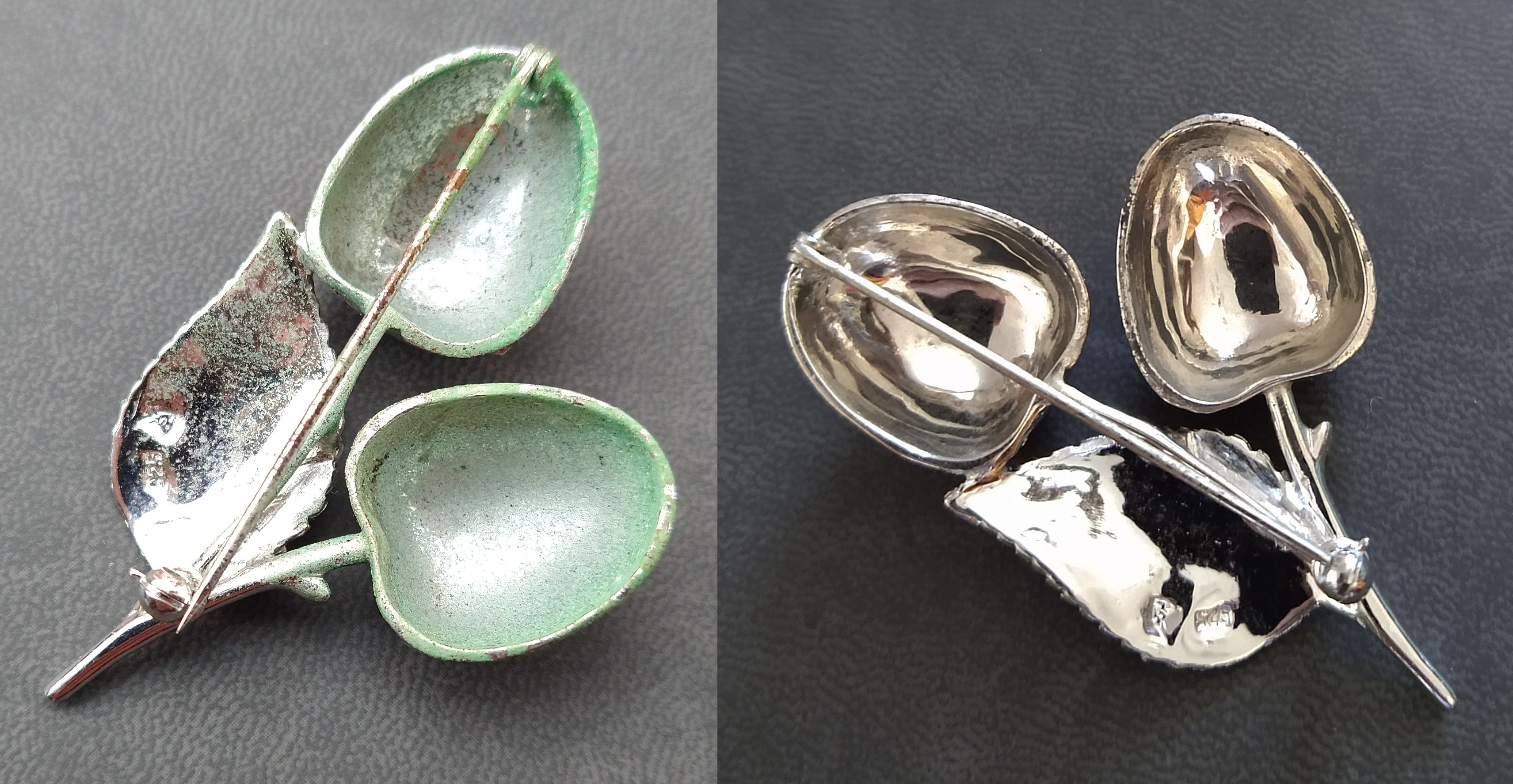 Не знаю как назвать эту брошь, сначала я подумала, что это "желуди", но листики больше похожи на березовые. Она серебряная с покрытием горячей эмалью. Есть две маркировки 925 и какой-то символ, не смогла его рассмотреть.