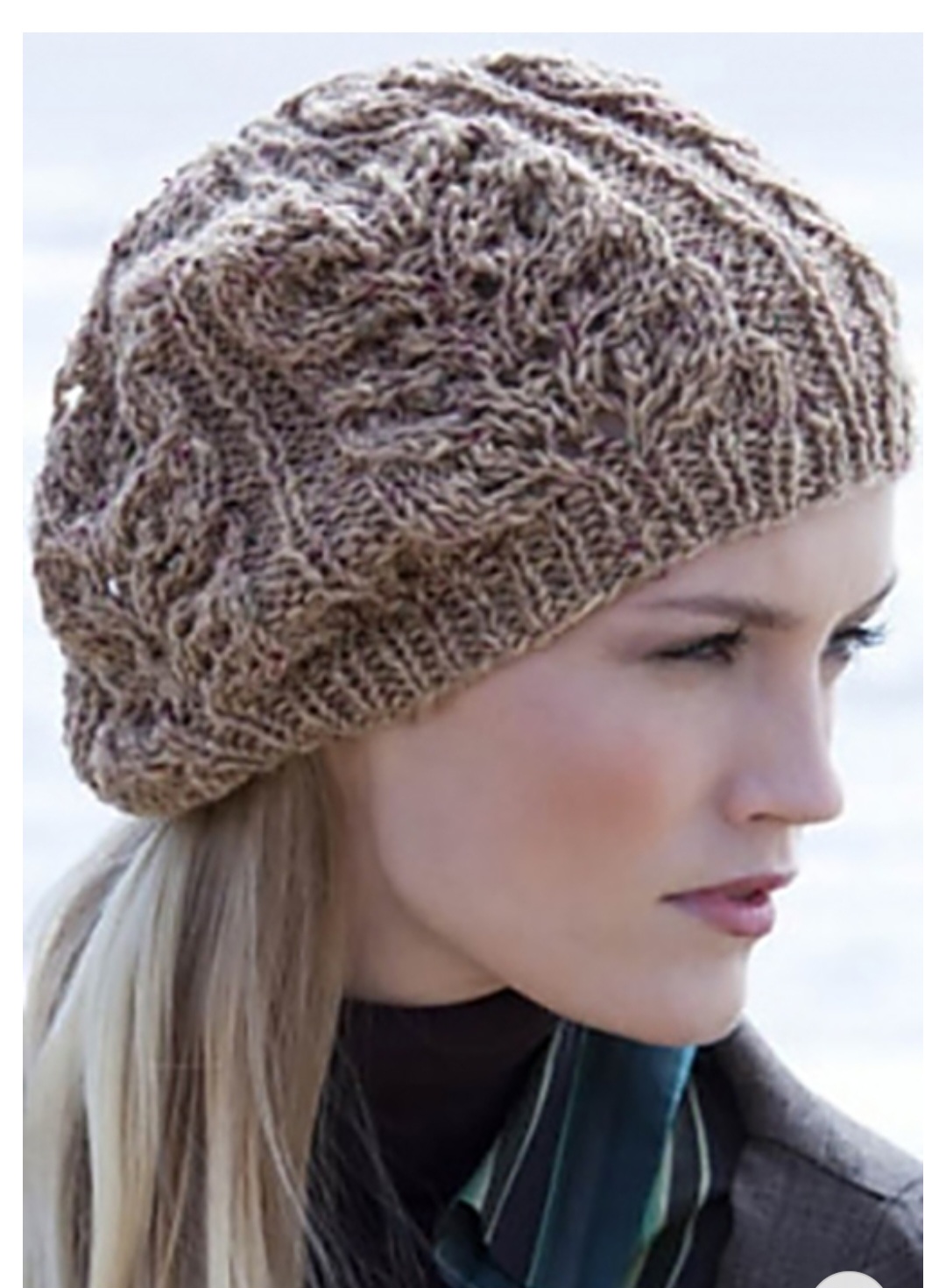 Размеры берета: окружность 51 см. Материалы: 100 г меланжевой пряжи типа «Dogenal Tweed» (100% шерсть экстра, 167 м/100 г); спицы № 4,5.