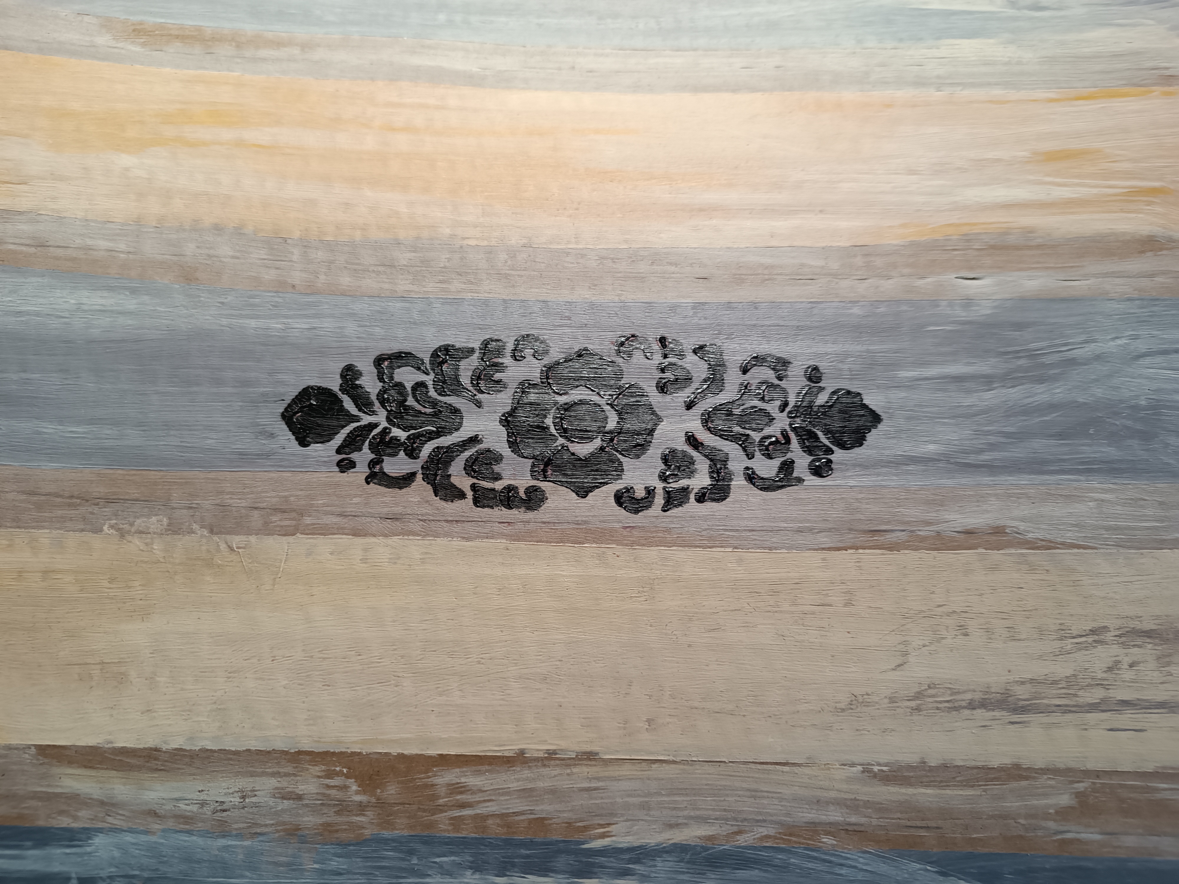 После высыхания разлиновала картон на части и сделала декор акриловыми красками в стиле старых досок. Когда краска высохла, нанесла декор по трафарету. После высушивания немного прошла по картону тонкой шкуркой и прочпокала кусочком губки жидко разведенной водой акриловой краской - умбра жженая. (Тикурилла). Покрыть лаком или не покрыть? Не покрыть - кто ж старые доски лаком покрывает...