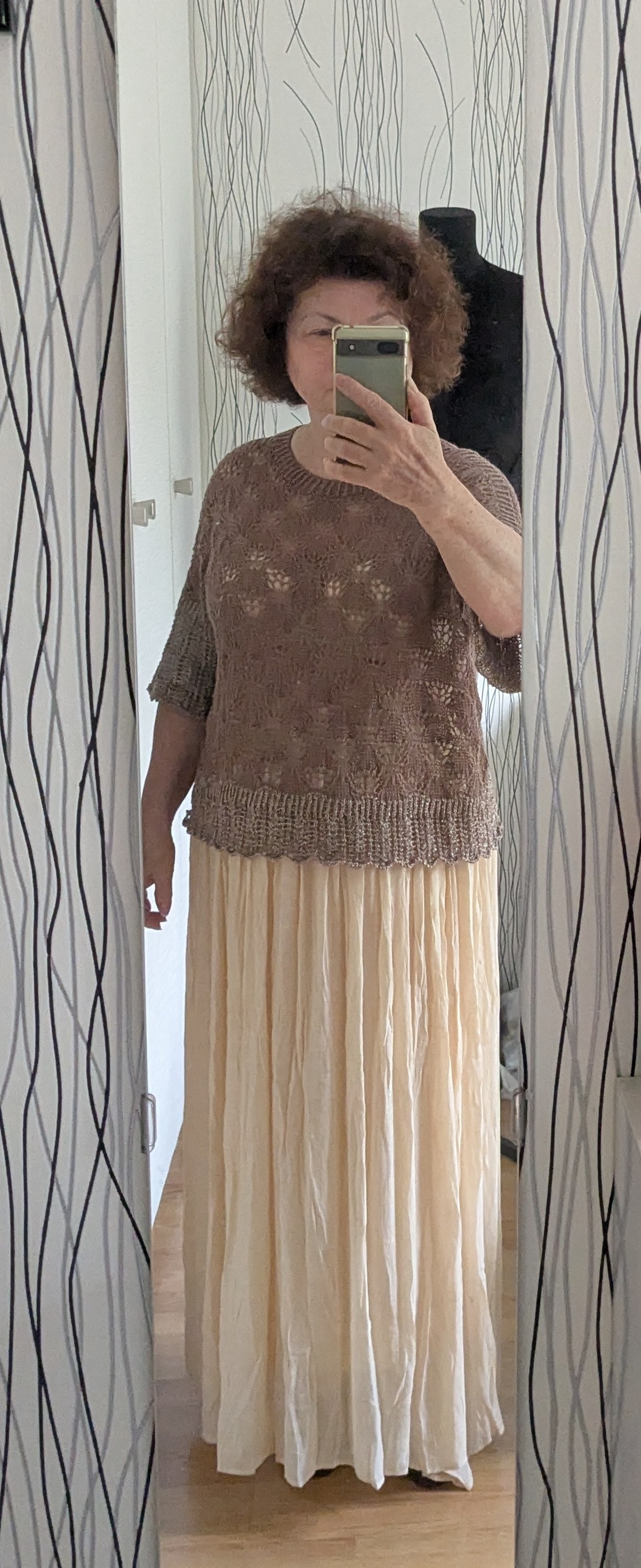 К отпуску связала красивый топик из шёлка и к нему надо было найти какую-нибудь широкую юбочку (так женственнее), думала, что это будет очень сложно, но всё сложилось отлично, в результате юбок оказалось две, эта и такая же зелёная. Шелковая кофточка очень подходила к зелёной юбке, а к светлой надо было что-то ещё связать, но летнее.