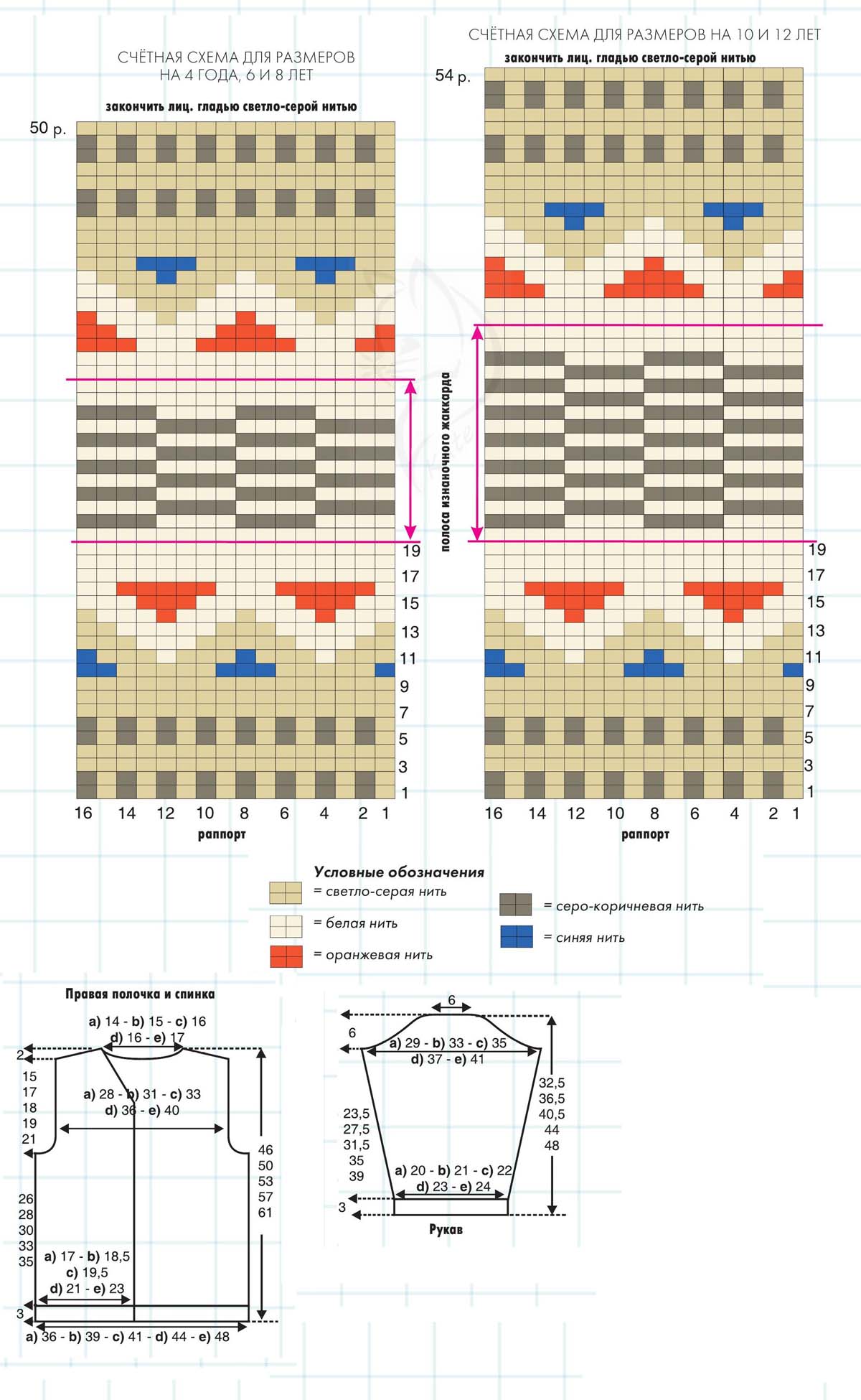Плотность вязания. Лиц. гладь, спицы № 5: 16 п. и 24 р. = 10х 10 см; жаккардовый узор, спицы № 5: 1 7 п. и 50/50/50/54/54 р. схемы = 10 х 23,5/23,5/23,5/25/25 см.