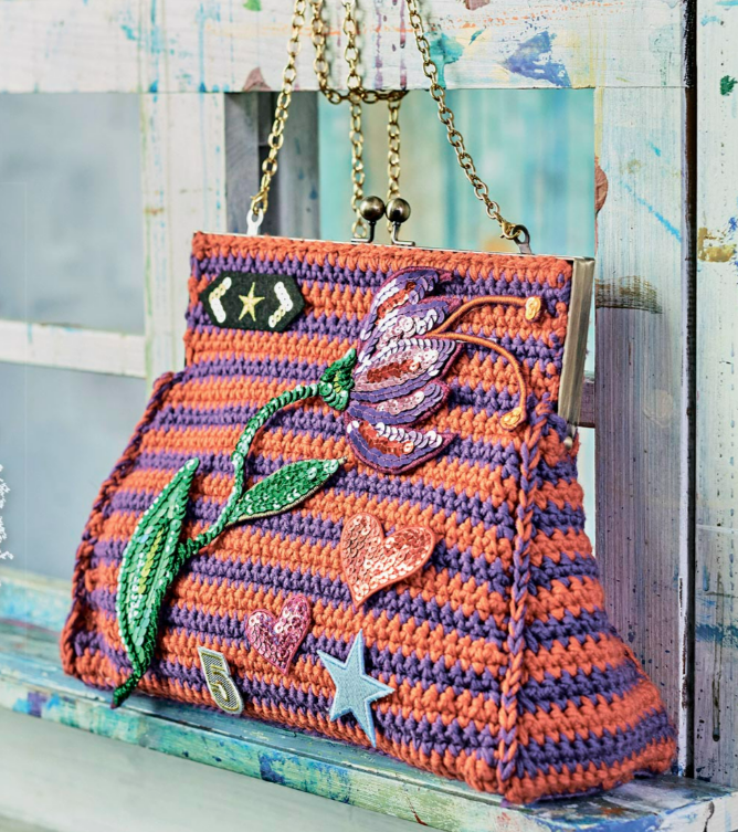 Пряжа (100% шерсти; 120 м/50 г) — 100 г цвета тыквы и 150 г фиолетовой; крючок № 4,5; застежка-рамка для сумки; ручка-цепочка с 2 карабинами длиной 100 cм; приутюживающиеся аппликации с пайетками.