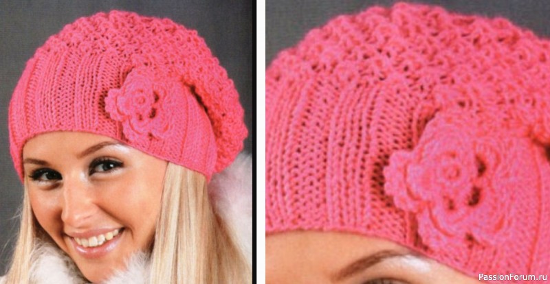 Далее повторяйте узор с 3-го ряда. Провяжите таким образом 38 рядов и соберите петли. Выполните шов на затылке. Крючком свяжите розочку и пришейте сбоку.
