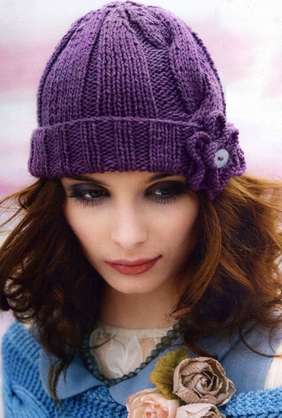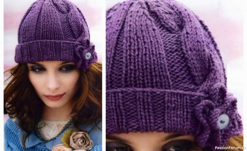 Вязаная шапочка с узором "коса" и цветком