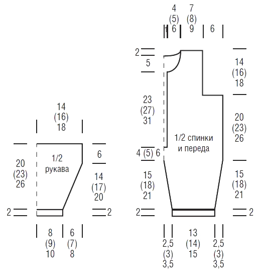 Передняя часть: вязать так же, как заднюю часть, но с разрезом для планки и более глубокой горловиной. Для этого через 19 (23) 27 см от резинки закрыть средние 5 п. и обе стороны закончить раздельно. На высоте спинки и таким же образом по внешнему краю выполнить проймы. На высоте пройм 7 (9) 11 см закрыть для горловины по внутреннему краю 1 x 5 (7) 9 п., затем в каждом 2-м р. 1 x 2 п. и 1 x 1 п. и по окончании в каждом 4-м р. закрыть 2 x 1 п. На высоте спинки закрыть оставшиеся петли плеча.