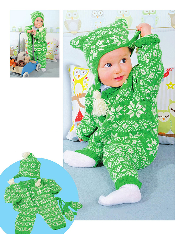 Вам потребуется: пряжа (100% шерсти; 120 м/50 г) -200 (250) 300 г зеленой и 150 (200) 200 г белой; для комбинезона: 6 бело-зеленых пуговиц; спицы № 3,5; короткие круговые спицы № 3,5; комплект чулочных спиц № 3,5; крючок № 3.