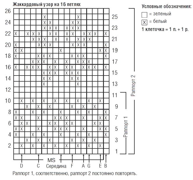 Жаккардовый узор на 16 петлях: вязать по схеме лицевой гладью двумя цветами, при этом нерабочую нить постоянно свободно протягивать по изнаночной стороне работы, чтобы вязаное полотно не стягивалось. Начать с петель от соответствующей стрелки, раппорт постоянно повторять и закончить согласно узору. Согласно инструкции постоянно повторять раппорт 1 или раппорт 2.