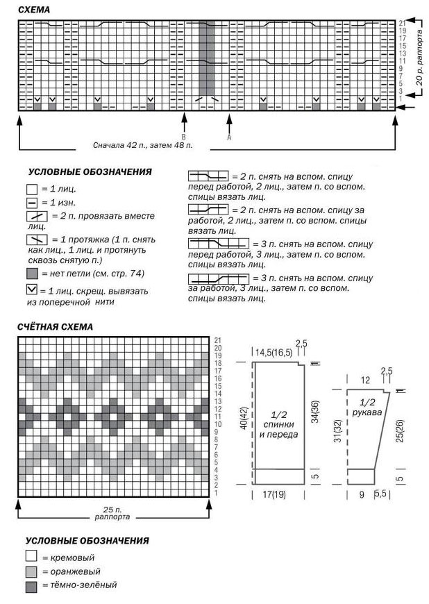 Рукава: крестообразным набором двойной кремовой нитью набрать 38 п. Вязать резинкой, начиная в 1-м изн. р. с кром., 1 изн., * 2 лиц., 2 изн., повторять от *, 2 лиц., 1 изн., кром. Через 5 см вязать следующим образом: кром., 5 п. лиц. глади, 24 п. узора с косами от начала схемы до стрелки В, 2 п. изн. глади, 5 п. лиц. глади, кром. После прибавлений и убавлений в 1-м р. на спицах 40 п. Для скосов рукава прибавить с обеих сторон в 9-м р. 1 х 1 п. и в каждом 10-м р. 4 х 1 п. = 50 п. Прибавленные п. вязать лиц. гладью. Через 30 (31) см от начала работы закрыть с обеих сторон 1 х 4 п. В след. р. закрыть все п.