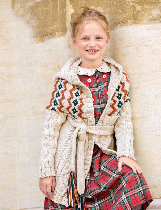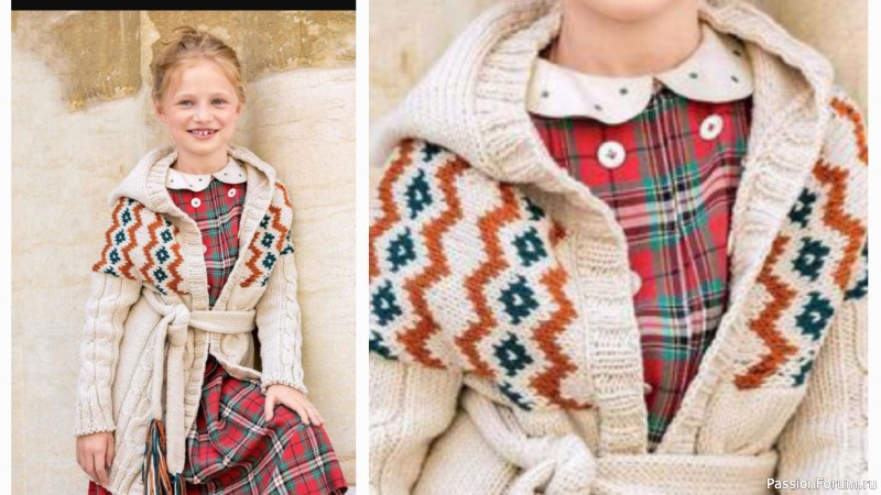 Детское пальто спицами для девочки с жаккардовым узором