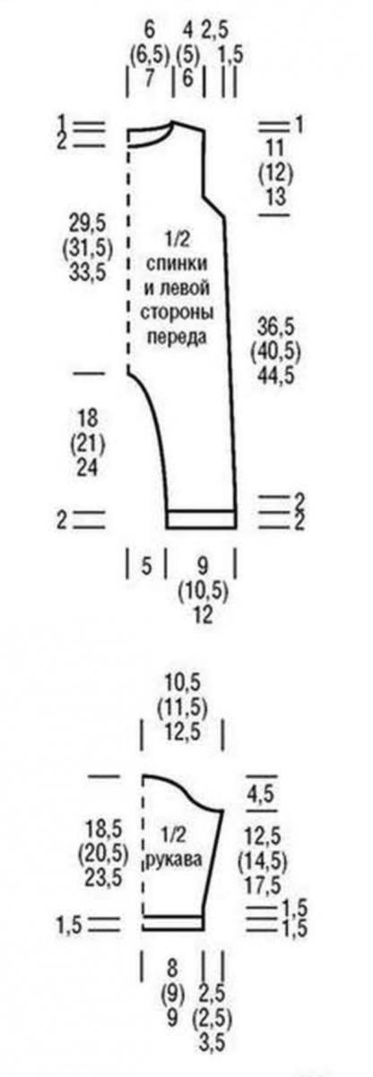 Спинка: петли левой и правой задних деталей перевести на спицы и продолжить вязать между кромочными лицевой гладью = 66 (74) 80 п. Для убавок по бокам в каждом 20-м р. с обеих сторон убавить 3 х 1 п. Через 38,5 (42,5) 46,5 см от линии сгиба планки для вырезов пройм в каждом 2-м р. с обеих сторон закрыть 2 х 2п.и2 х 1 п. Через 49,5 (54,5) 59,5 см от линии сгиба планки для выреза горловины средние 16 (18) 20 п. закрыть и плечи довязать до конца раздельно, при этом во 2-м р. с края выреза закрыть 1 х 6 п. Одновременно для правого плеча с внешнего края закрыть 1 х 5 (6) 7 п., а затем во 2-м р. закрыть 1 х 5 (7) 8 п. Через 50,5 (55,5) 60,5 см от линии сгиба планки все петли будут закрыты. Для левого плеча дополнительно связать 2 р., а затем в зеркальном отображении выполнить убавки правого плеча. Через 51,5 (56,5) 61,5 см от линии сгиба планки все петли будут закрыты.