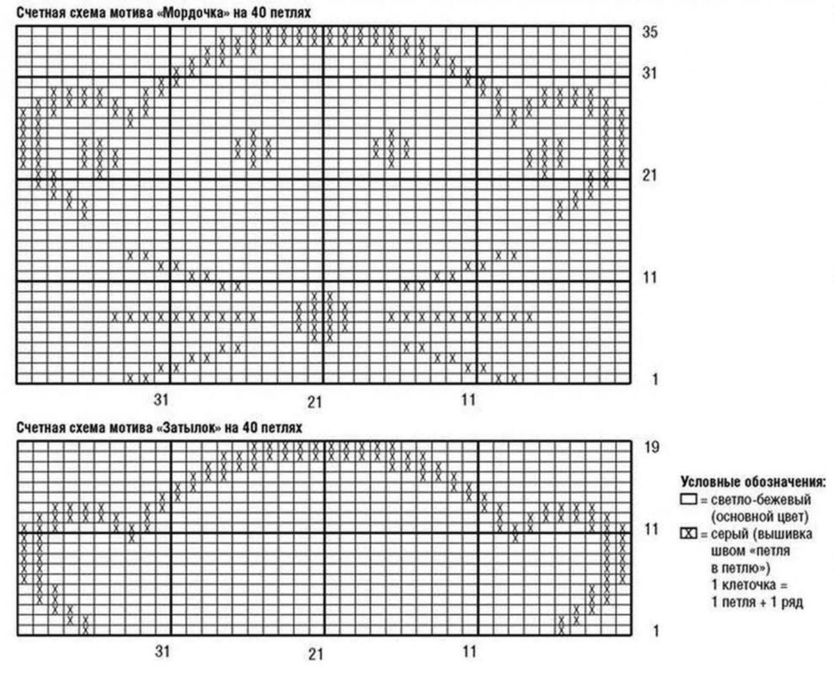 Сборка: детали слегка увлажнить, растянуть согласно указанным на выкройке размерам и дать высохнуть. Выполнить правый плечевой шов. По краю выреза горловины на круговые спицы № 3 светло-бежевой нитью набрать 86 (94) 112 п., связать 1 ряд лицевыми, затем все петли закрыть. Для планок с внутренней стороны штанин на спицы № 2,5 светло-бежевой нитью набрать для каждой штанины по 7 п. и вязать 40 (46) 52 см резинкой. Затем все петли закрыть. Планки пришить к внутренним сторонам штанин. Хвостик пришить к задней стороне в середине, отступив вверх от шаговой линии около 7 см. Мордочку и затылок вышить серой нитью швом «петля в петлю» спереди и сзади согласно счетной схеме. Вшить рукава так, чтобы середина рукава совпадала с плечевым швом. Выполнить боковые швы и швы рукавов. Планки рукавов и штанин отвернуть на изнаночную сторону и пришить, 7 (7) 9 кнопочных застежек пришить к планкам штанин и 2 кнопочные застежки пришить на левое плечо.