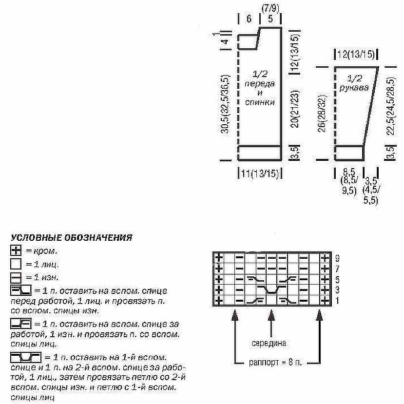 Узор с косами: число петель кратно 8 + 1 + 2 кром. Вязать по схеме. В изн. р. вязать по рисунку. Повторять с 1-го по 10-й р.