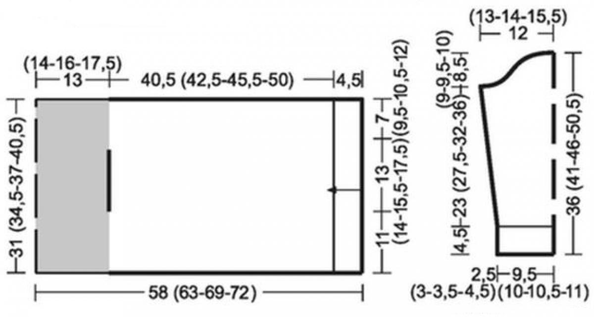 Важно: полочки и спинку вязать, как одну деталь. Сначала вязать левую полочку в направлении снизу вверх, после проймы в поперечном направлении вязать спинку, после этого в зеркальном отображении выполнять вторую пройму и правую полочку сверху вниз. Стрелка на схеме выкройки показывает направление вязания для левой полочки.