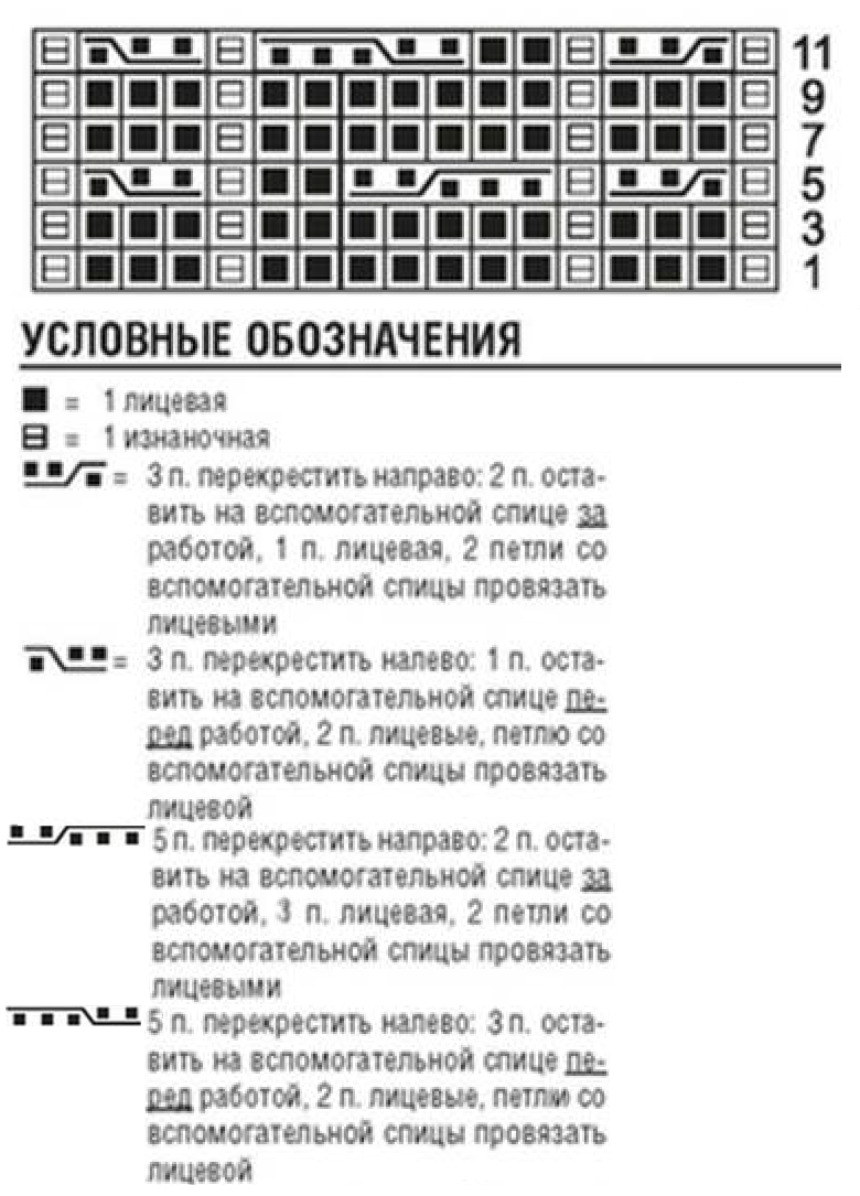 Узор «Коса» на 17 петлях: вязать по приведенной схеме. В высоту постоянно повторять 1-12-й р.