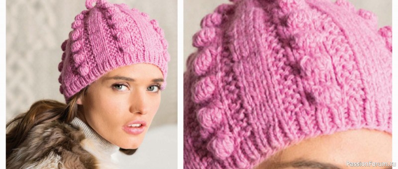 Розовая шапка спицами с шишечками