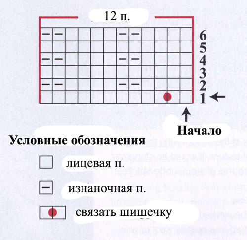 Начните вязать узор с шишечками по схеме. Свяжите с 1 по 6-й ряд пока высота изделия от начала не достигнет 10(12,5) см.