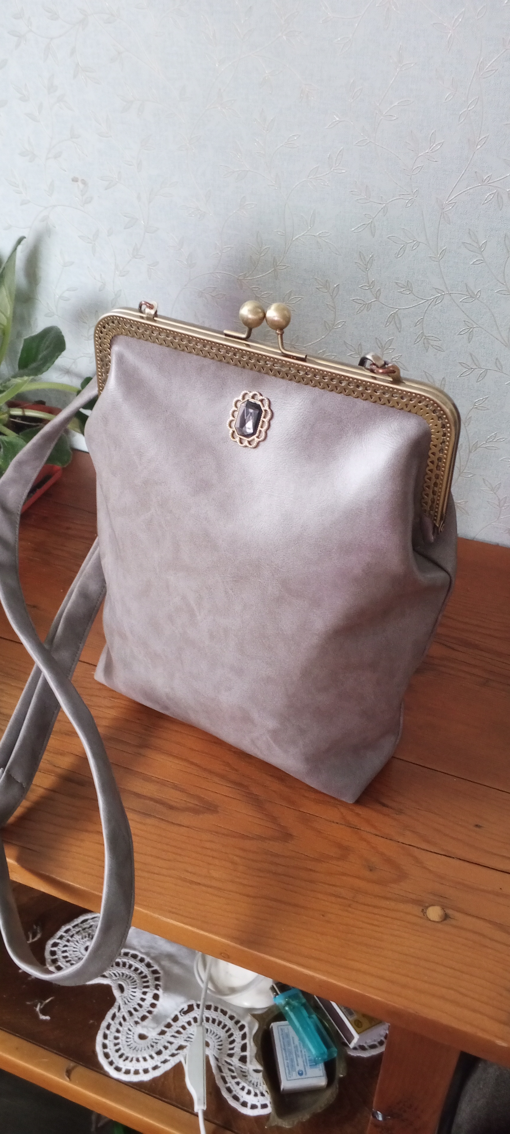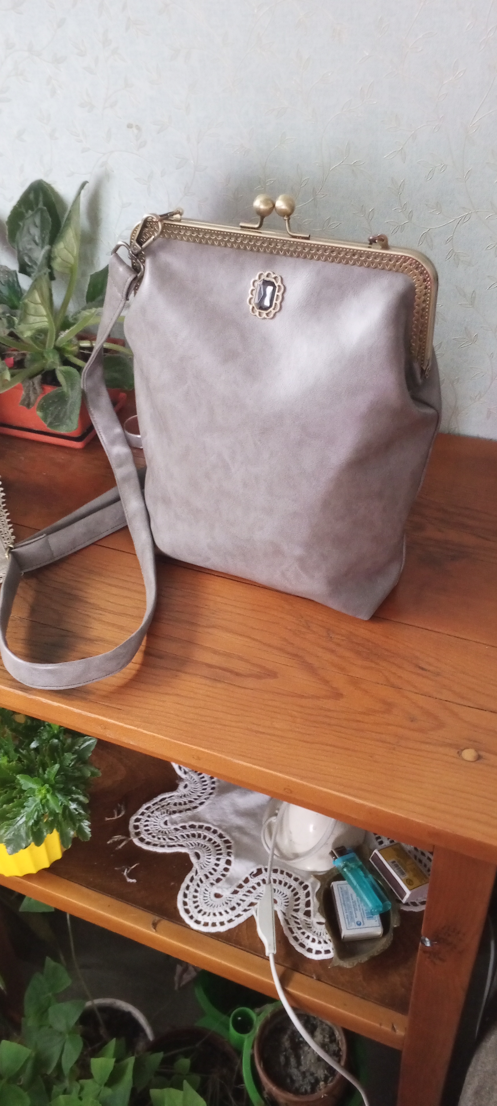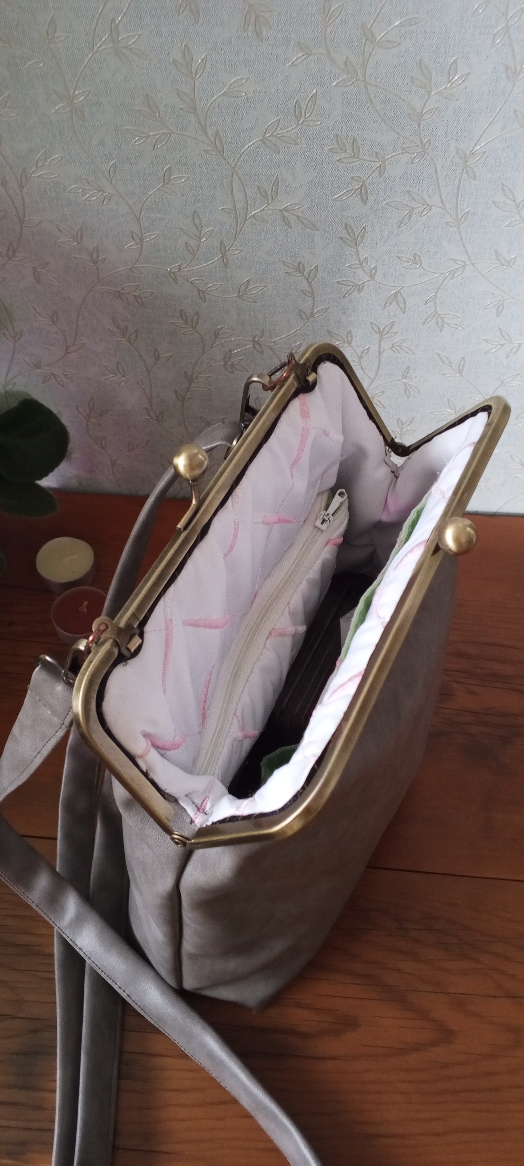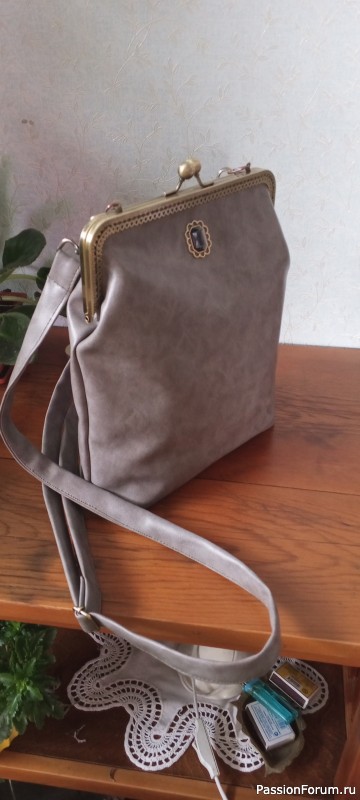 Никогда у меня не было сумки через плечо. Решила, что пора завести и сшила сумку на фермуаре. Хотела сшить из кожи, но пока соображала, какой толщины брать кожу, ушло много времени. Чтобы не перегореть, купила кожзам. Выкройку не делала, кроила сразу на материале. Нужна была плоская, но вместительная. Вот что получилось