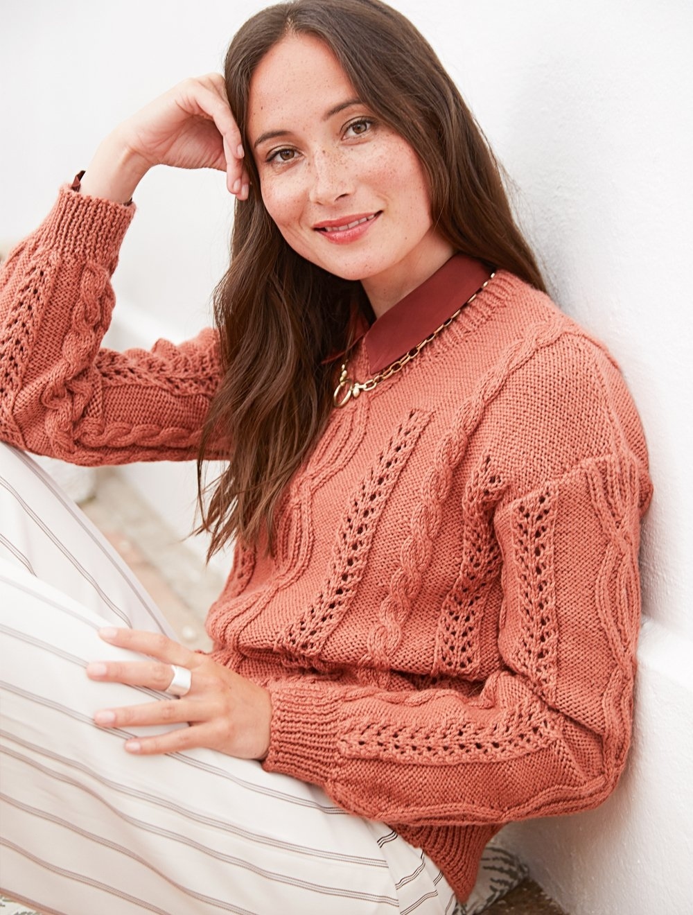 Пряжа Rico, Essentials Merino Plus dk (50% шерсти, 50% акрила; 50 г/125 м) — 10 (11) 12 (14) 15 мотков терракотовой (цвет 016); прямые спицы №3,5 и 4; вспомогательные спицы.
