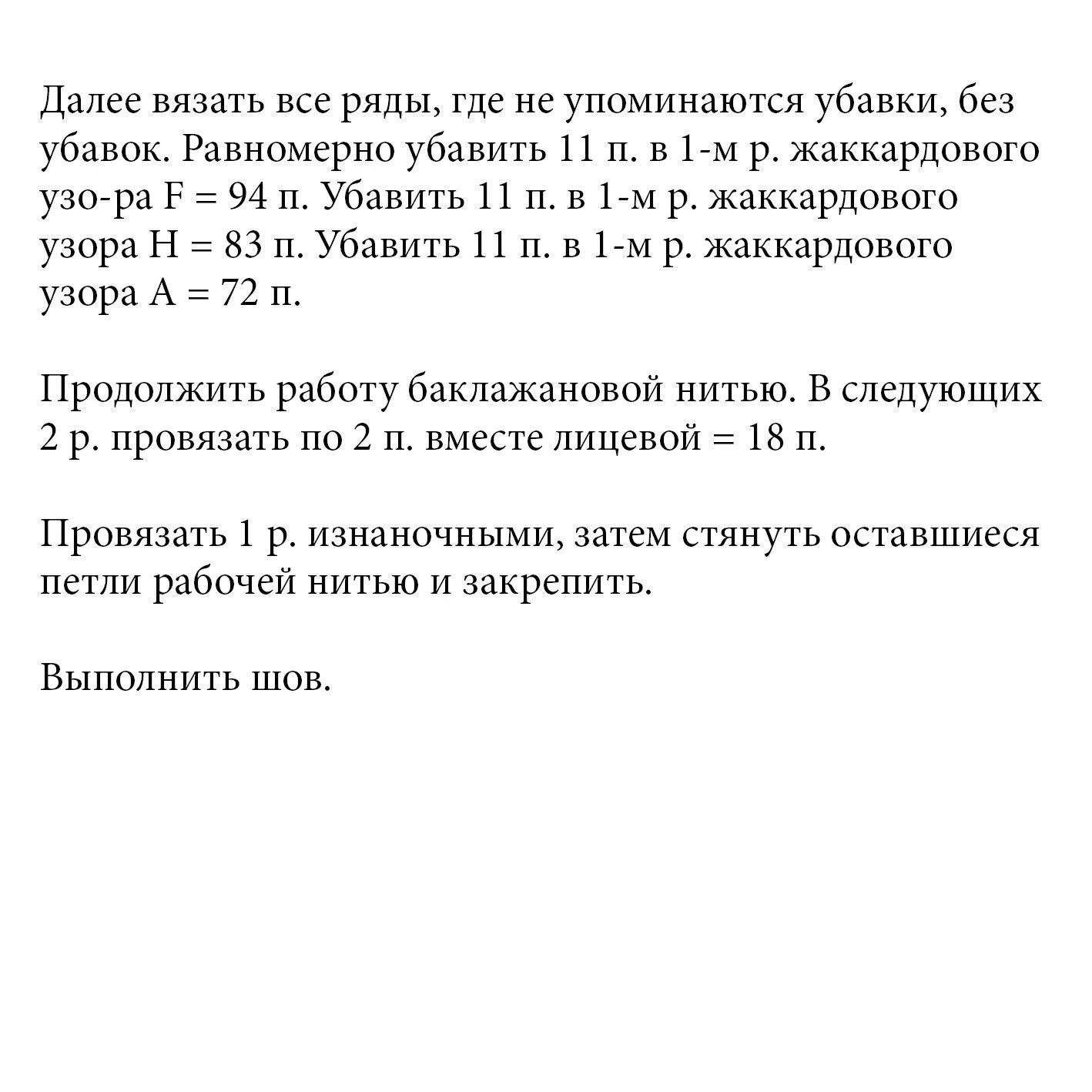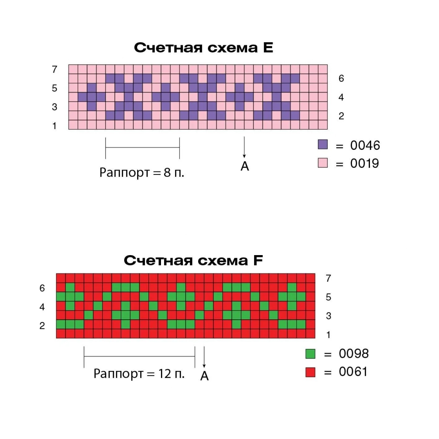 Вязать лицевой гладью по счетной схеме F. На схеме обозначены лицевые и изнаночные ряды. В высоту выполнить 1 раз с 1-го по 7-й р.