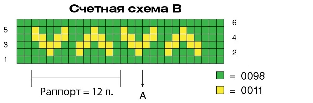Вязать лицевой гладью по счетной схеме В. На схеме обозначены лицевые и изнаночные ряды. В высоту выполнить 1 раз с 1-го по 6-й р.