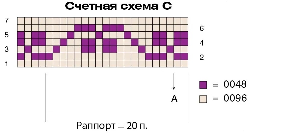 Вязать лицевой гладью по счетной схеме С. На схеме обозначены лицевые и изнаночные ряды. В высоту выполнить 1 раз с 1-го по 7-й р.