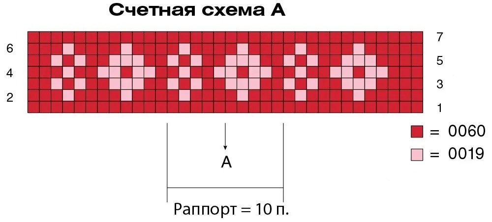 Вязать по счетной схеме, А лицевой гладью. На схеме обозначены лицевые и изнаночные ряды. В высоту выполнить 1 раз с 1-го по 7-й р.
