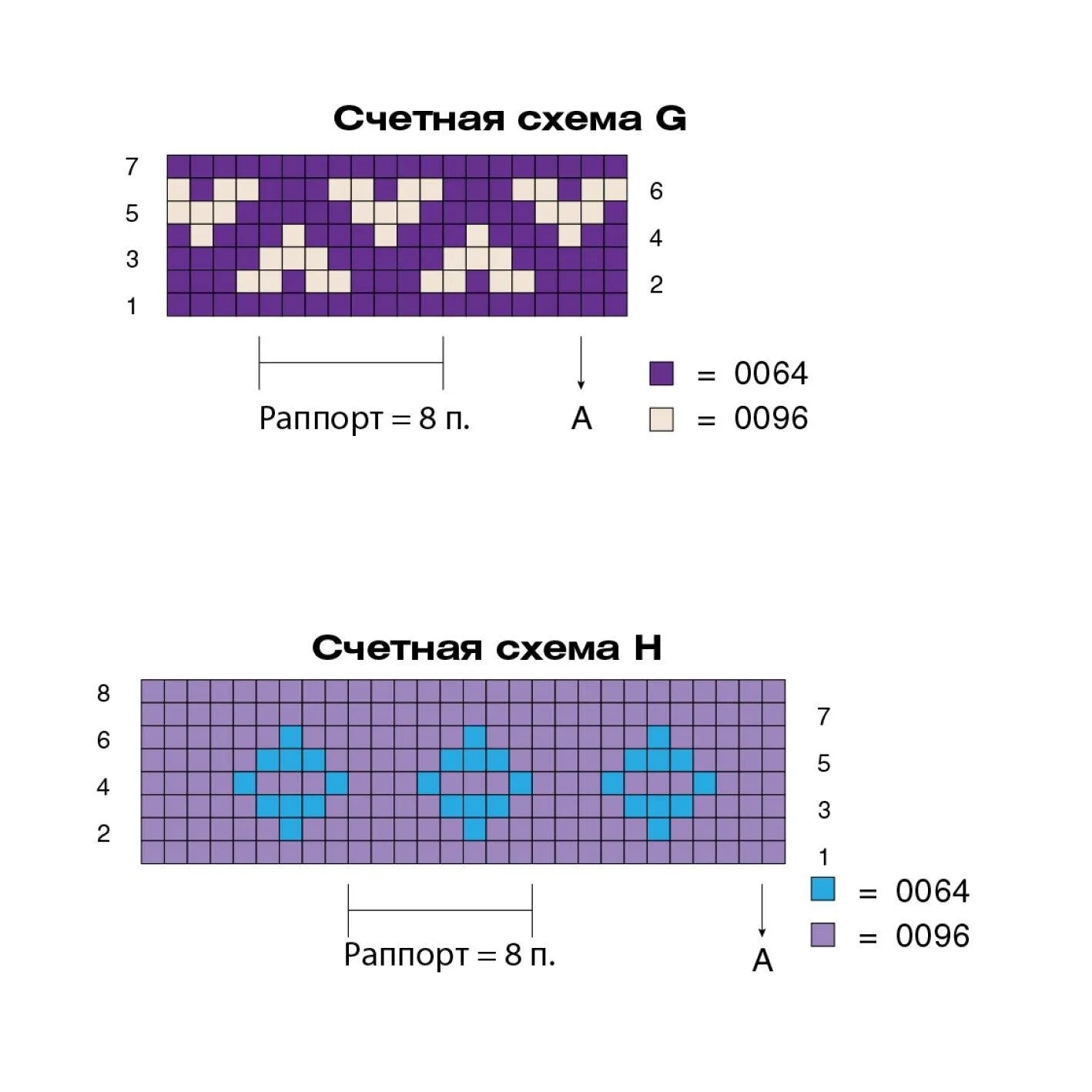 Вязать лицевой гладью по счетной схеме G. На схеме обозначены лицевые и изнаночные ряды. В высоту выполнить 1 раз с 1-го по 7-й р.
