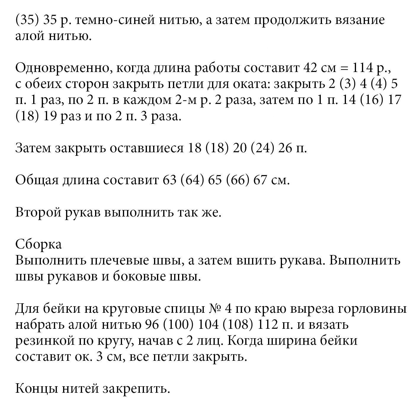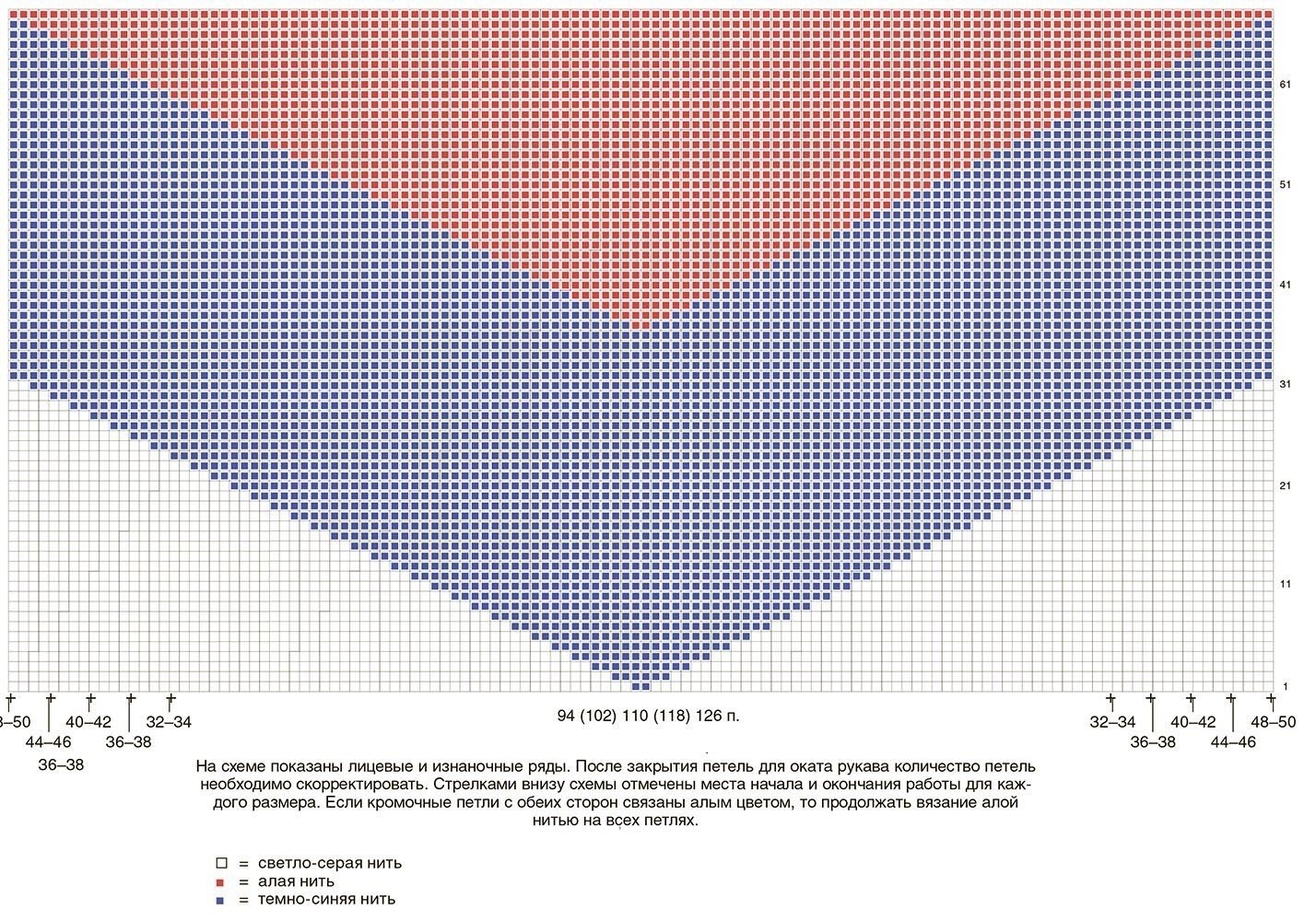 Пряжа Schachenmayr, Мerino Extrafine 120 (100% новой шерсти; 50 г/120 м) — 7 (7) 8 (8) 9 мотков светло-серой (цвет 00103); 2 (2) 3 (3) 4 мотка темно-синей (цвет 00150); 2 (2) 3 (3) 4 мотка алой (цвет 00142); прямые спицы № 4; круговые спицы № 4 длиной 40 см.