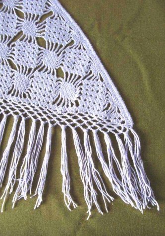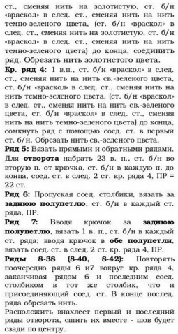 Деталь подъема. 1-й ряд (лиц.): 7 (7, 9) возд. п., провязывать за задние дуги; ст. б/н во 2-ю возд. п. от крючка и в каждую из след.3 (3, 5) возд. п., 2 ст. б/н в след. возд. п., ст. б/н в след. возд. п., провязывать с противоположной стороны возд. п., пропустить последнюю провязанную возд. п., 2 ст. б/н в след. возд. п., ст. б/н в каждую из последних 4 (4, 6) возд. п., повернуть. [13 (13, 17) ст. б/н] 2-й ряд: 1 возд. п., ст. б/н в каждый из первых 4 (4, 6) ст. б/н, (2 ст. б/н в след. ст. б/н, ст. б/н в след. ст. б/н) 2 раза, 2 ст. б/н в след. ст. б/н, ст. б/н в каждый из последних 4 (4, 6) ст. б/н, повернуть. [16 (16, 20) ст. б/н] 3-й ряд: 1 возд. п., ст. б/н в каждый из первых 3 (3, 5) ст. б/н, (2 ст. б/н в след. ст. б/н, ст. б/н в каждый из след. 2 ст. б/н) 3 раза, 2 ст. б/н в след. ст. б/н, ст. б/н в каждый из последних 3 (3, 5) ст. б/н, повернуть. [20 (20, 24) ст. б/н] 4-й ряд: 2 возд. п., полуст. с/н в каждый из след. 3 (3, 5) ст. б/н, (2 полуст. с/н в след. ст. б/н, полуст. с/н в каждый из след. 2 ст. б/н) 4 раза, полуст. с/н в каждый из последних 4 (4, 6) ст. б/н, повернуть. [24 (24, 28) п/ст. с/н] 5-й ряд: 1 возд. п., ст. б/н в первый полуст. с/н, Гр в ст. б/н на 2 ряда ниже, пропустить полуст. с/н в этом ряду за группой, (ст. б/н в след. полуст. с/н, Гр в след. ст. б/н на 2 ряда ниже, пропустить полуст. с/н в этом ряду позади Гр) 1 (1, 2) раза, ст. б/н в каждый из след. 2 полуст. с/н, (Гр в ст. б/н на 2 ряда ниже, не пропускать полуст. с/н в этом ряду позади Гр, ст. б/н в каждый из след. 2 полуст. с/н) 2 раза, (Гр в ст. б/н на 2 ряда ниже, пропустить полуст. с/н в этом ряду позади Гр, ст. б/н в след. полуст. с/н) 2 раза, Гр в след. ст. б/н на 2 ряда ниже, пропустить полуст. с/н в этом ряду позади Гр, (ст. б/н в каждый из след. 2 полуст. с/н, Гр в ст. б/н на 2 ряда ниже, не пропускать полуст. с/н позади Гр) 2 раза, ст. б/н в след. полуст. с/н, (Гр в ст. б/н на 2 ряда ниже, пропустить полуст. с/н в этом ряду позади Гр, ст. б/н в след. полуст. с/н) 2 (2, 3) раза, повернуть. [28 (28, 32) п.] 6-й ряд: 2 возд. п., полуст. с/н в каждую из след. 5 (5, 7) п., (2 полуст. с/н в след. петлю, полуст. с/н в каждую из след. 2 п.) 5 раз, 2 полуст. с/н в след. петлю, полуст. с/н в каждую из последних 6 (6, 8) п., повернуть. Только для размеров S и М. В конце последнего ряда закрепить нить и отрезать. Только для размера L. 7-й ряд: 1 возд. п., ст.б/н в каждую петлю. Отрезать и закрепить нить.