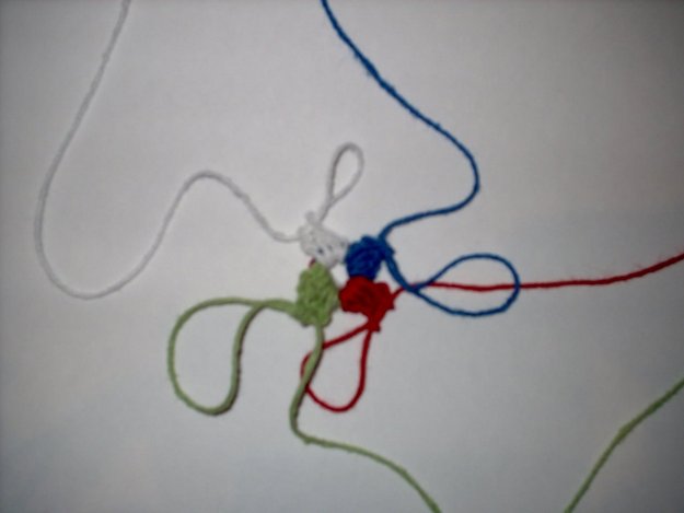 Точно так же сделайте и с ниткой четвертого цвета. Первый ряд оригинальной салфетки готов!