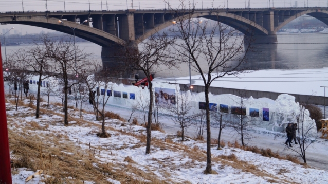 А сейчас хочу показать ледовую галерею постеров картин и фотографий красноярских художников, которая расположилась на нижнем ярусе набережной. Все сюжеты показывают красоту нашей сибирской природы на фоне Енисея.