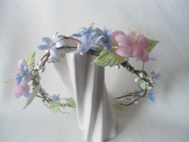 Вот , сотворила-ободок и веночек. Смотрю, на них и , сердце радуется.Потом решила и шиповник-брошь, к ним добавить.Получилась-весенне-летняя компания.