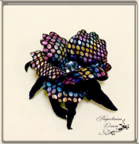 Очень быстро делается. Только ткань у меня была уже обработана желатином с изнаночной стороны. С изнаночной стороны обвела выкройку лепестка.. Похожего на розу, только волнистый край, Вырезала ножницами. Приклеила с изнанки летоны на каждый(проволочки обкрученые гофробумагой. ) Подлистник выкроила из бархата. Все детали при помощи клея ПВА приклеила на дублирующую ткань (искусств. шелк.тоже на желатине) Вырезала. Придала форму инструментами. Наклеила при помощи клеевого пистолета, на кусочек кожи сначала подлистник.Потом по очереди лепестки. Серединки оформила стразиками или бусинками. Все.)Спасибо, Людмила за оценку. Забыла сказать. Проволочки приклеивала для того, чтобы листики можно было отгибать по желанию. Вот в более светлую забыла приклеить. И она получилась более плоская. А темная более рельефная.