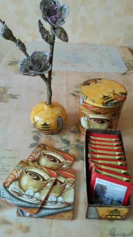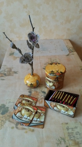 Покопалась еще, - нашла старую пластиковую банку, совершенно потерявшую вид, а также три разномастных старых подставки под кружки. Взяла коробочку из-под чая, обрезала ее. И в довершение достала из своего рабочего шкафчика два цветка из мешковины, которые сделала на пробу в декабре. Ну вот, картинка стала складываться, добавила недавно купленные для декупажа и очень понравившиеся салфетки. На балконе стоит плетеная старая корзина, и в ней букет из веток и сухоцветов, взяла из нее веточку.