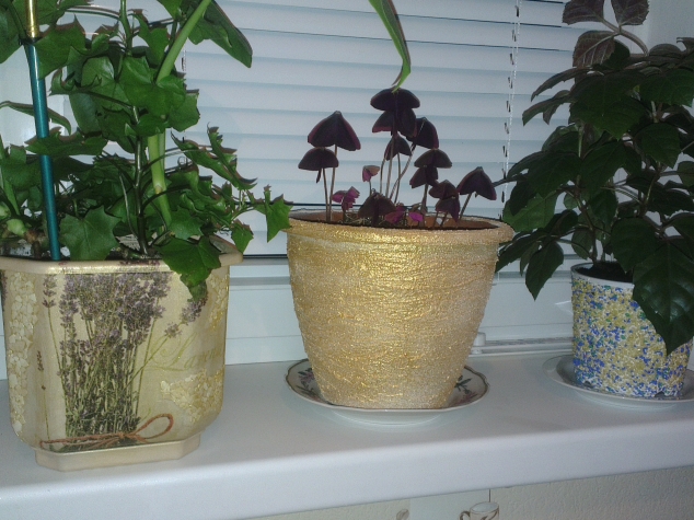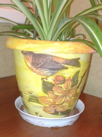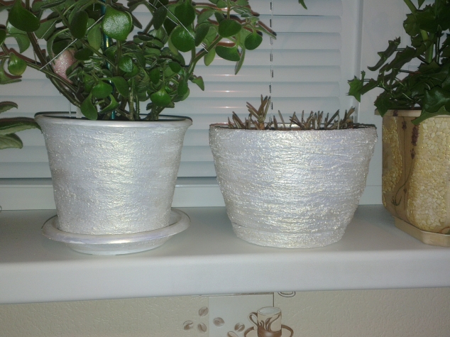 Не знаю как ее можно назвать, пришла идея в голову сама) сначала грунтуется горшок, затем развожу до консистенции густой сметаны стартовую штукатурку и наношу на горшок, прорези делала столовой вилкой, после того как материал высох на горшке, покрываю белой акриловой краской, после ее высыхания — серебристой акрил.краской, все.