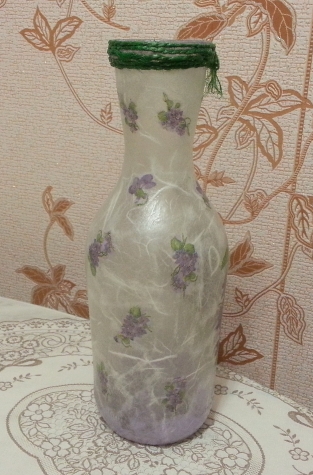 Попросили из бутылки сделать вазу, вот что получилось с рисовой бумагой. Еще и досочка на подарок.