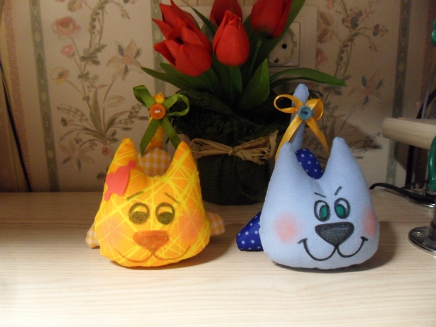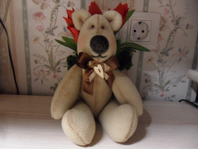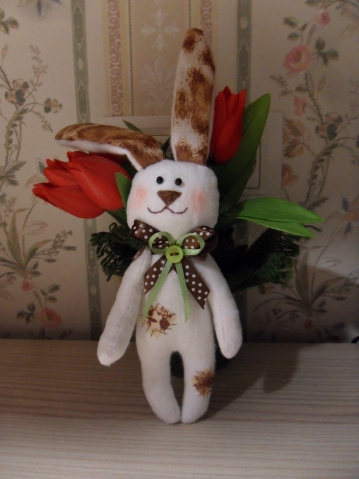 Решила сшить ещё зайца, потом медведя, потом понеслось: коты. Зайца шила, но не с флиса, а с пелёночной ткани и вот, что получилось: стройный заяц с тонкими и худыми ножками .