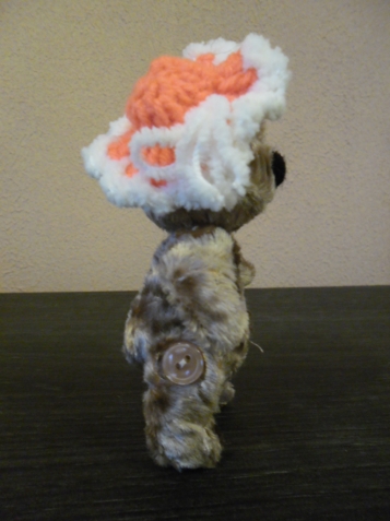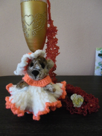 Приглашаю вас в гости. Вот такая малышка у меня родилась.Рост ее 10см сидя. Платье и шляпка связано крючком.. Игрушка полностью сшита в ручную.Платье снимается, а вот шляпка нет, я ее закрепила на ушке.