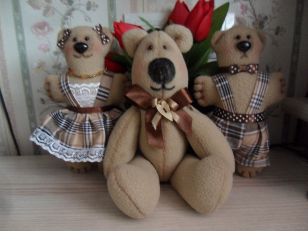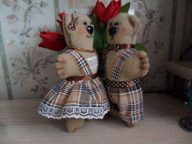 Похвастушки . Сделала медвежаток парочку и самой нравится как я их одела. Очень понравилась эта ткань в клеточку.