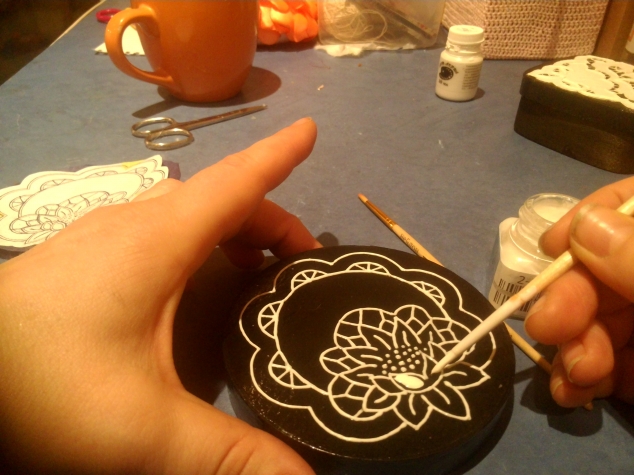 А теперь один ВАЖНЫЙ МОМЕНТ. После того, как краска высохла на работе появились синие разводы! Но не везде. Это от КАЛЬКИ!! Поэтому у нас два выхода: или распечатку с другой стороны обрабатывать грифелем, а потом ложить и обводить ручкой, или просто обводить рисунок ручкой. Так как у нас на работе не один слой лака, то рисунок просто продавится)) Хотя с синей калькой так легко)) Поэтому я поступила по другому. Просто взяла и залила еще раз контурную краску)) Сверху покрыла два слоя акриловым лаком