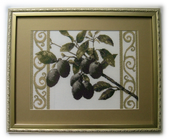 Очень радовалась, когда вышивала этот несложный рисунок - сливы, как аметисты, вырисовывались на белой канве, а оттенки светлой зелени на листьях плавно перетекали в глубокий зелёный цвет.