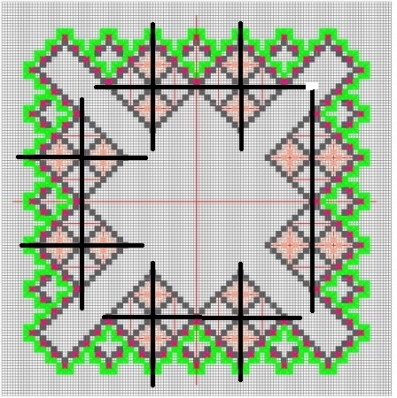 Раз деталь симметричная, обязательно оси симметрии нужны! Они всегда помогут контролировать вышивку! Вышила одну сторону и, вышивая вторую, смотри на вышитую и делай зеркально также! Чем больше разметок на канве, тем меньше будем ошибаться!!!