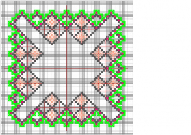 Не забываем, что одна клетка на схеме соответствует двум нитям ткани равномерного переплетения (равномерки)!